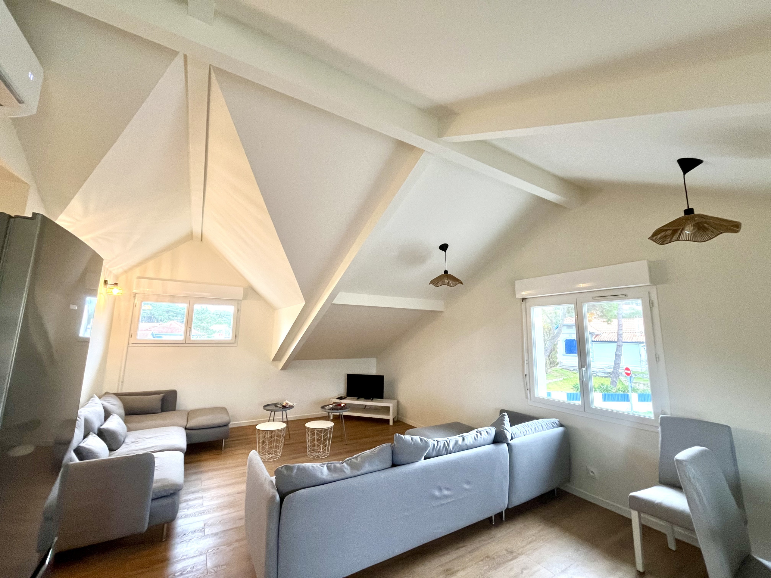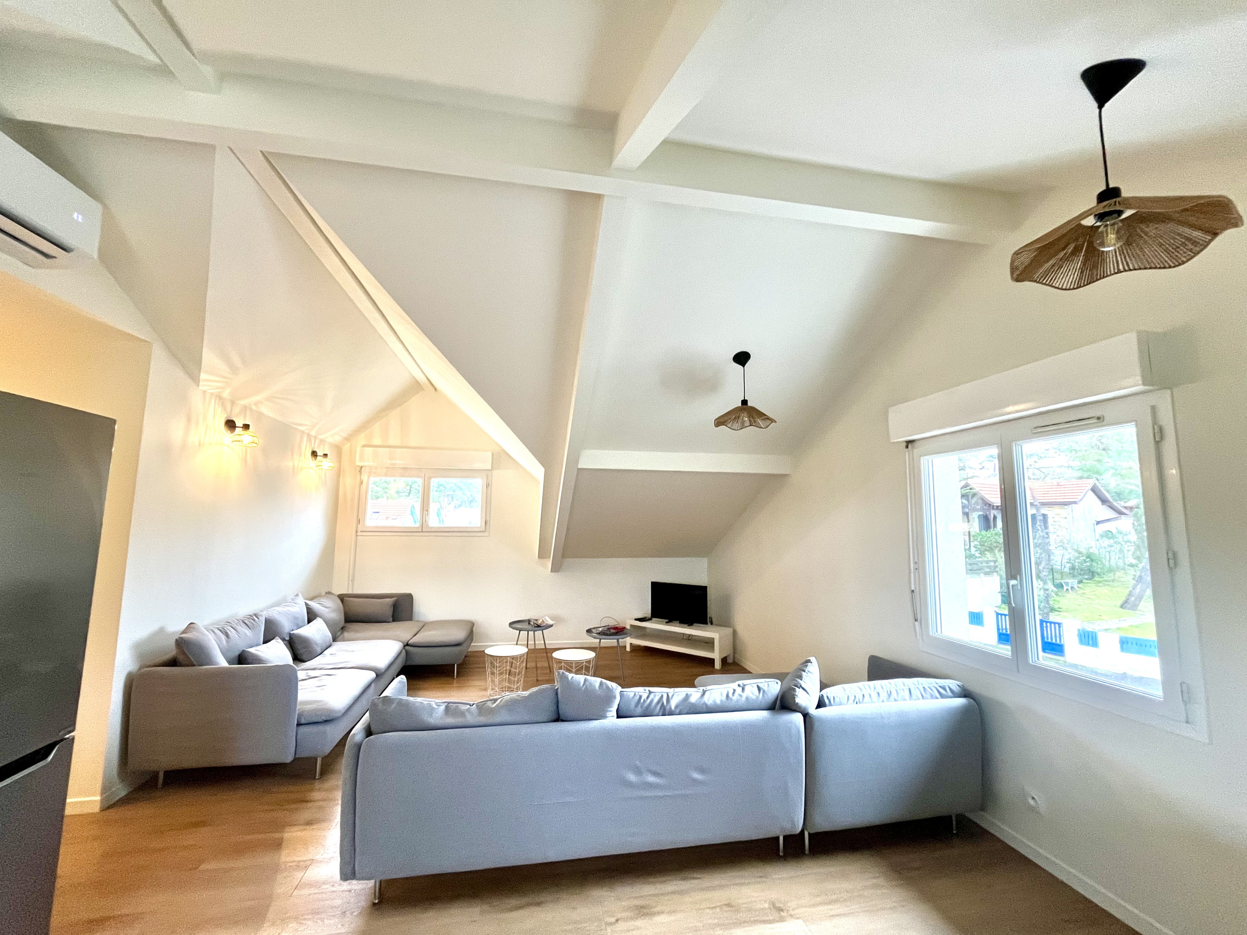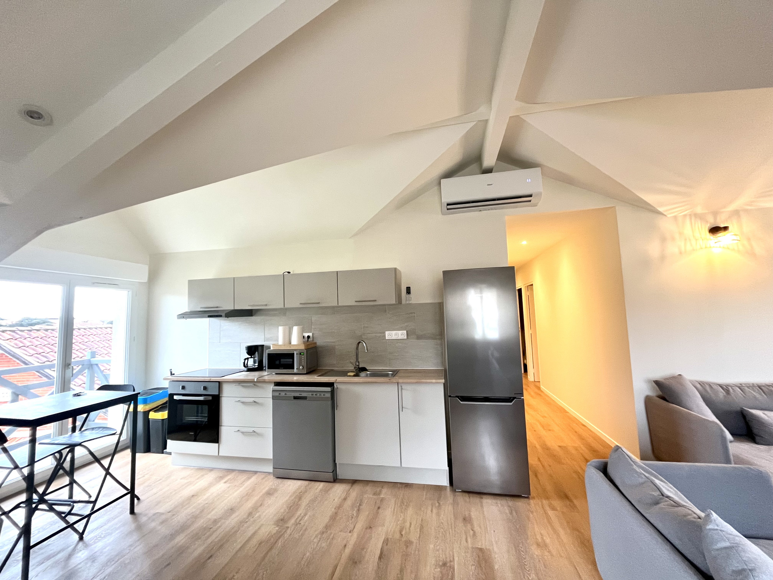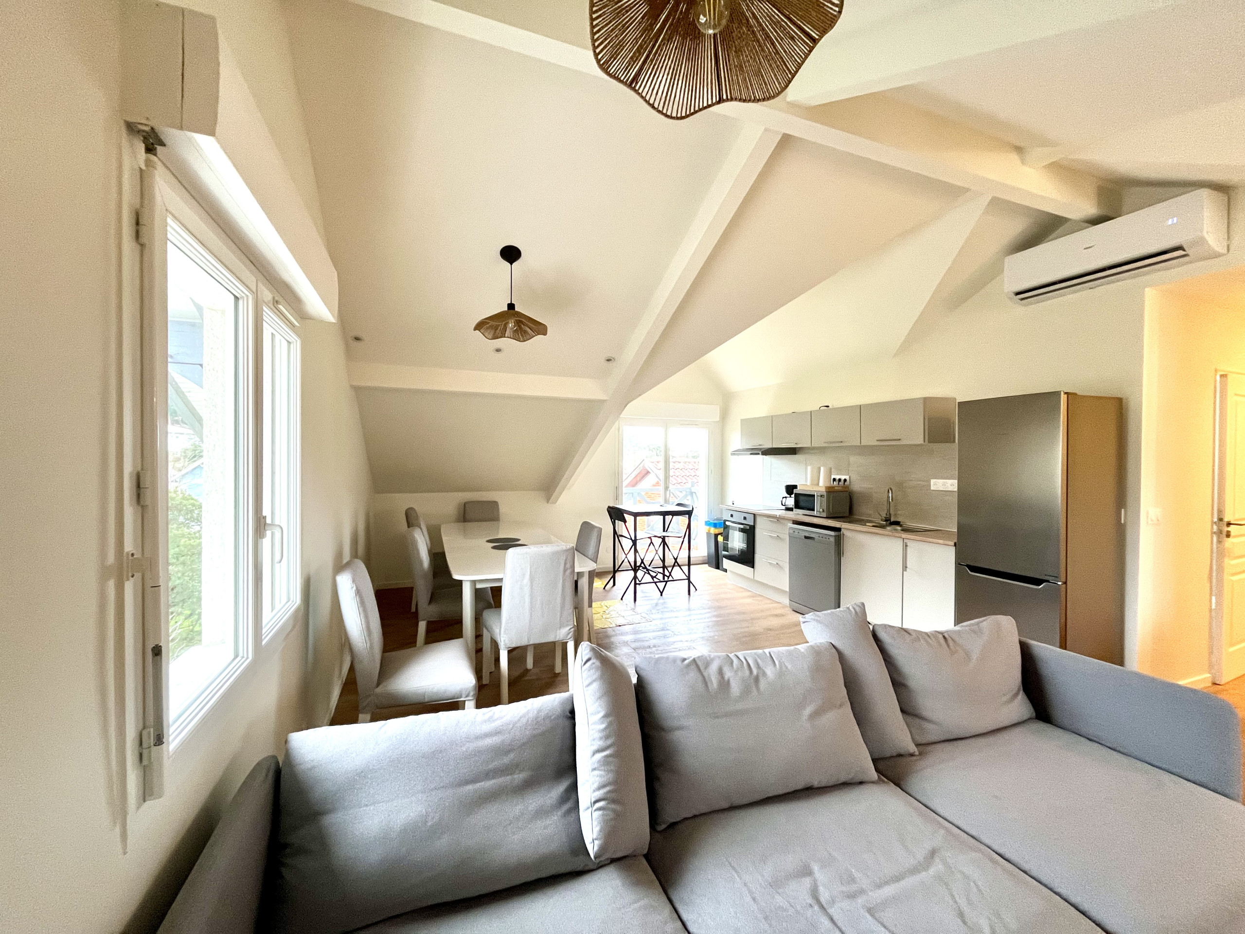 L’espace de vie se compose d’un salon chaleureux avec canapés, télévision, ouvert sur un espace repas convivial. La cuisine, moderne et entièrement équipée, permet de séjourner en toute autonomie et de préparer facilement les repas après une journée de plage ou de surf à Lacanau Océan.