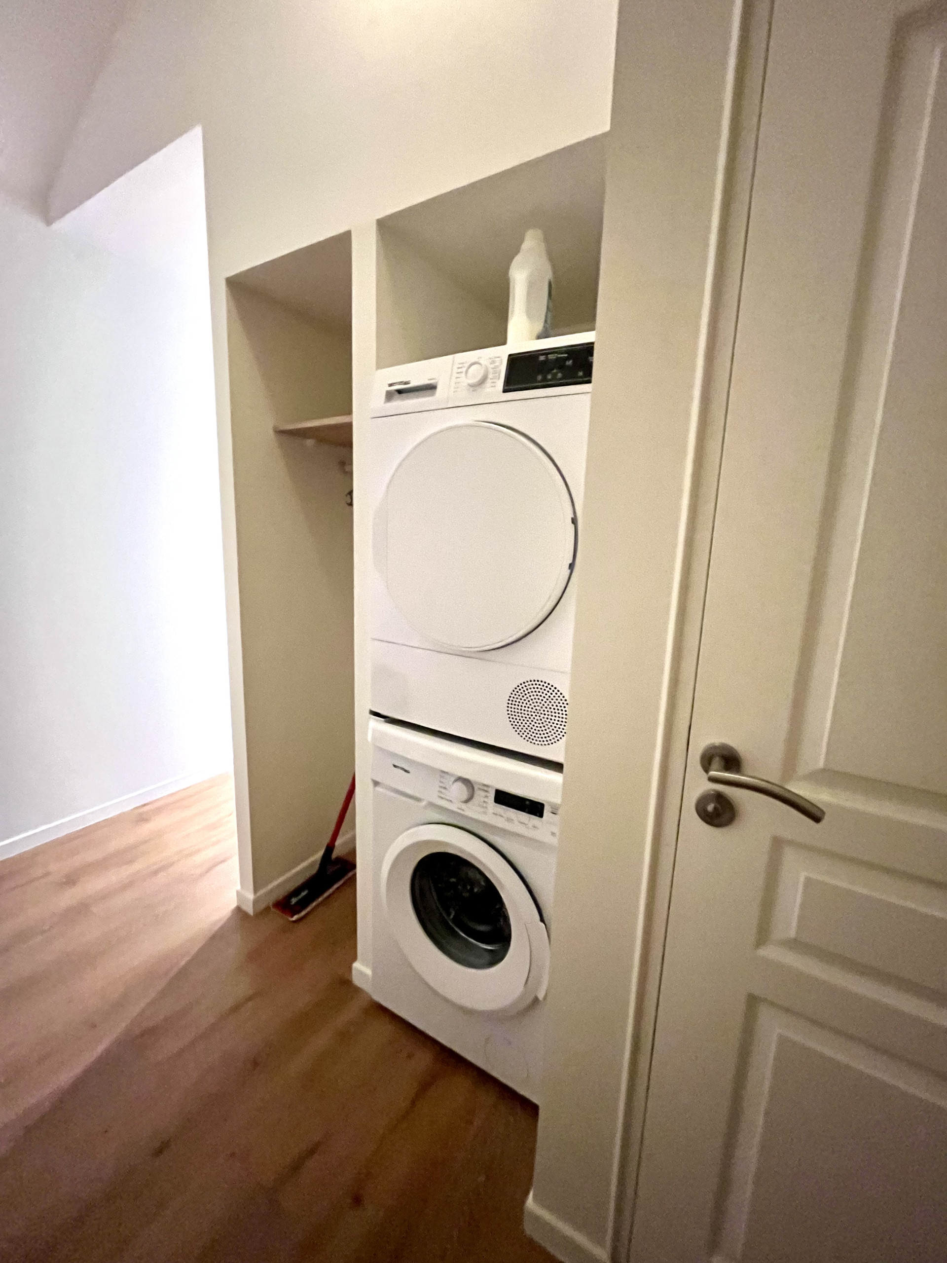 L'entrée spacieuse dessert un coin buanderie avec lave linge sèche linge ainsi qu'un WC indépendant.