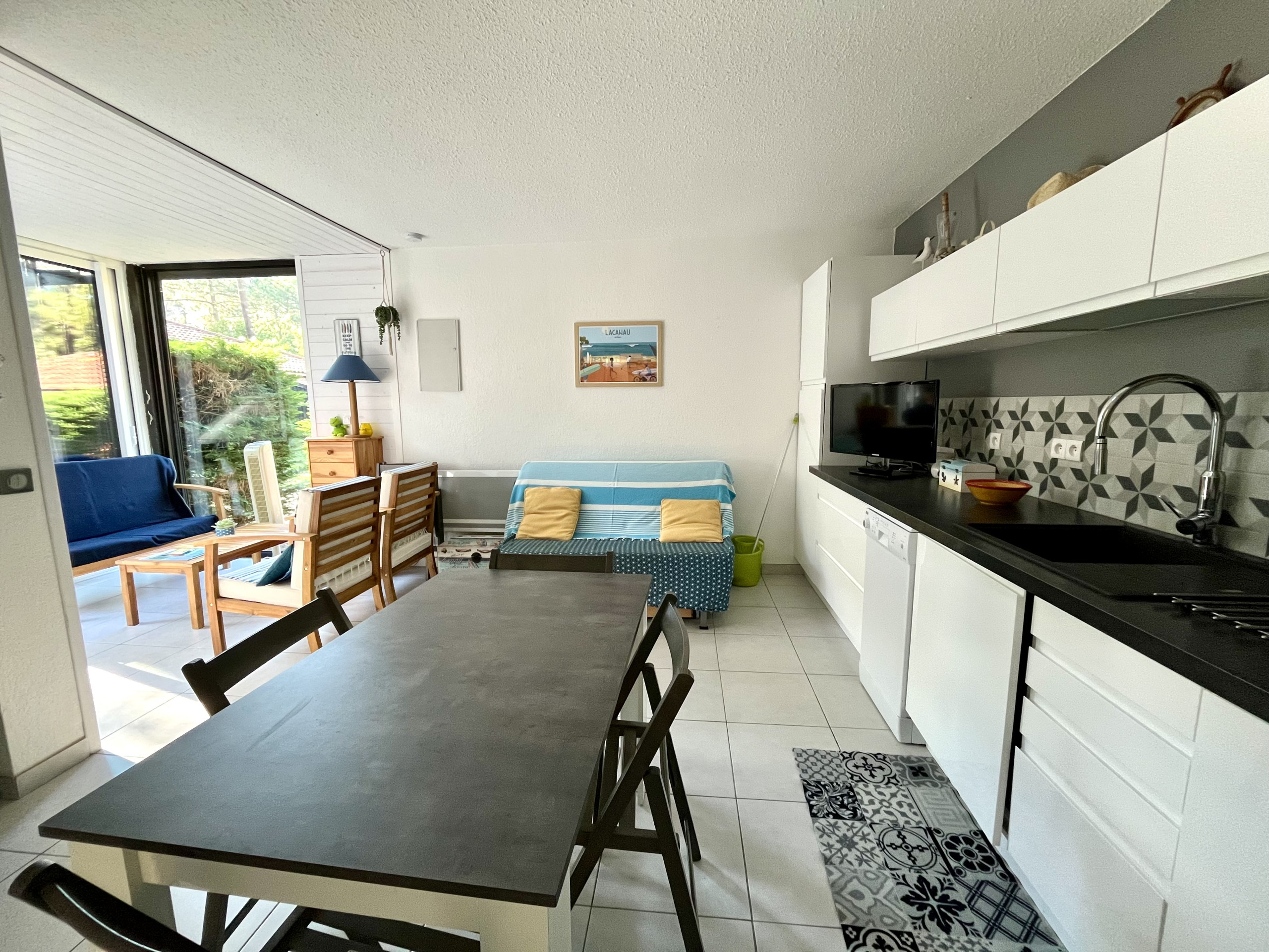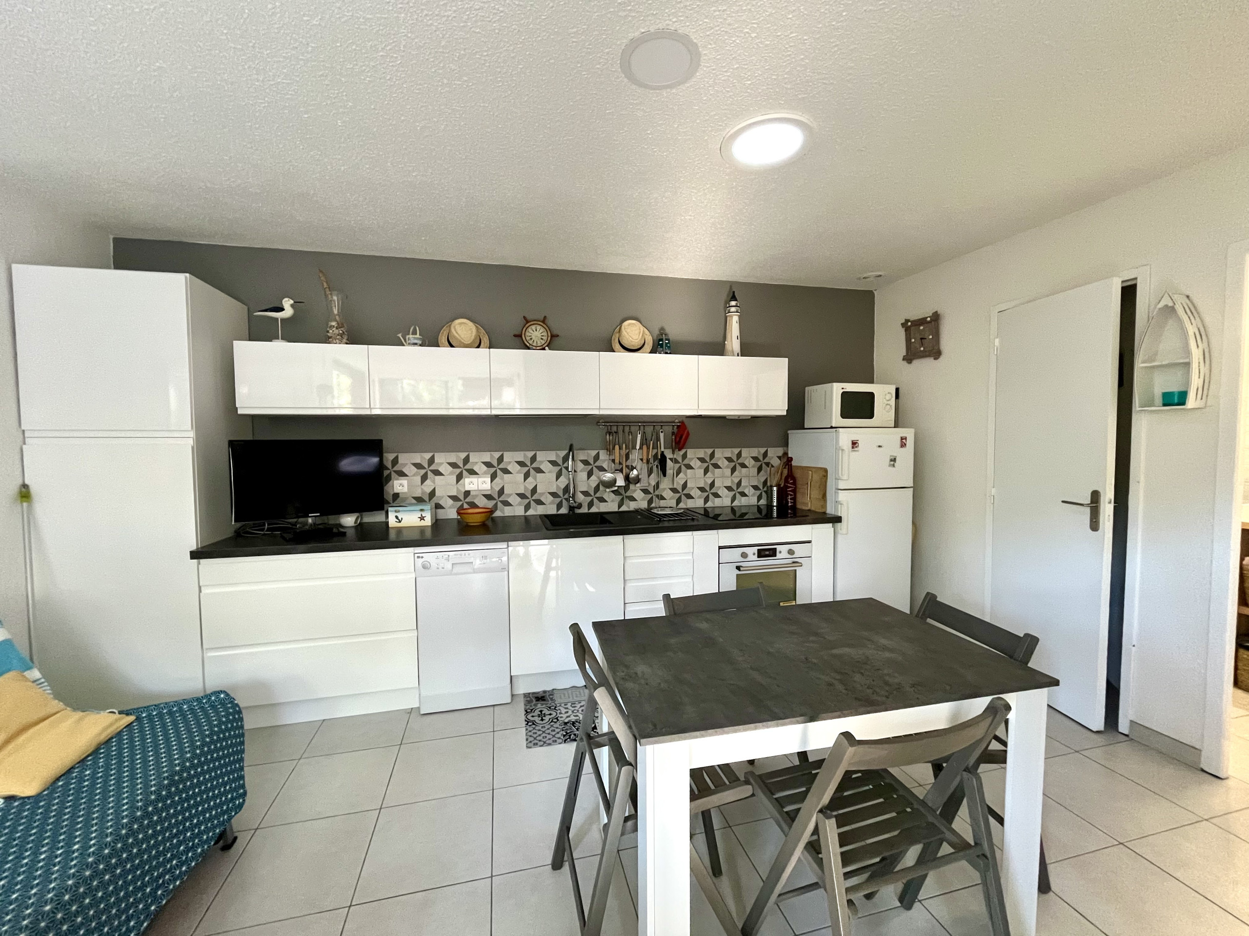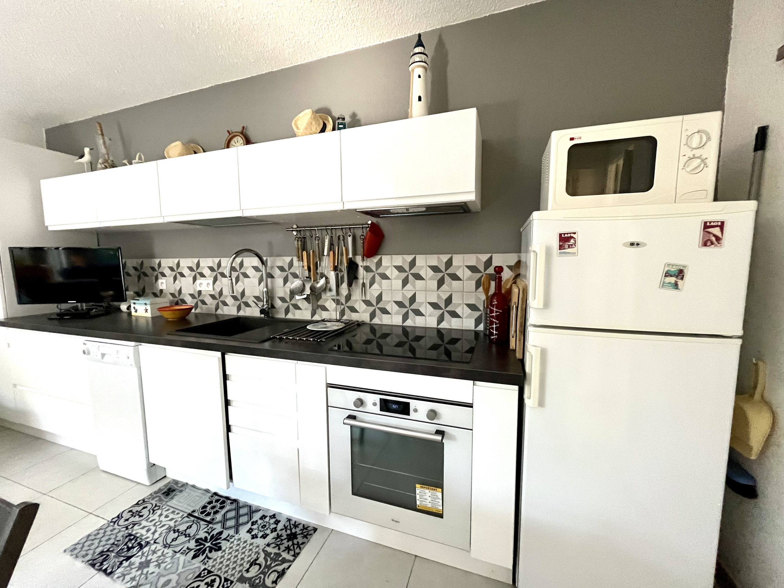 CUISINE OUVERTE SUR SEJOUR : évier - plaques chauffantes électriques - réfrigérateur/congélateur - four - hotte - lave vaisselle - placards de rangement - vaisselle et ustensiles de cuisine