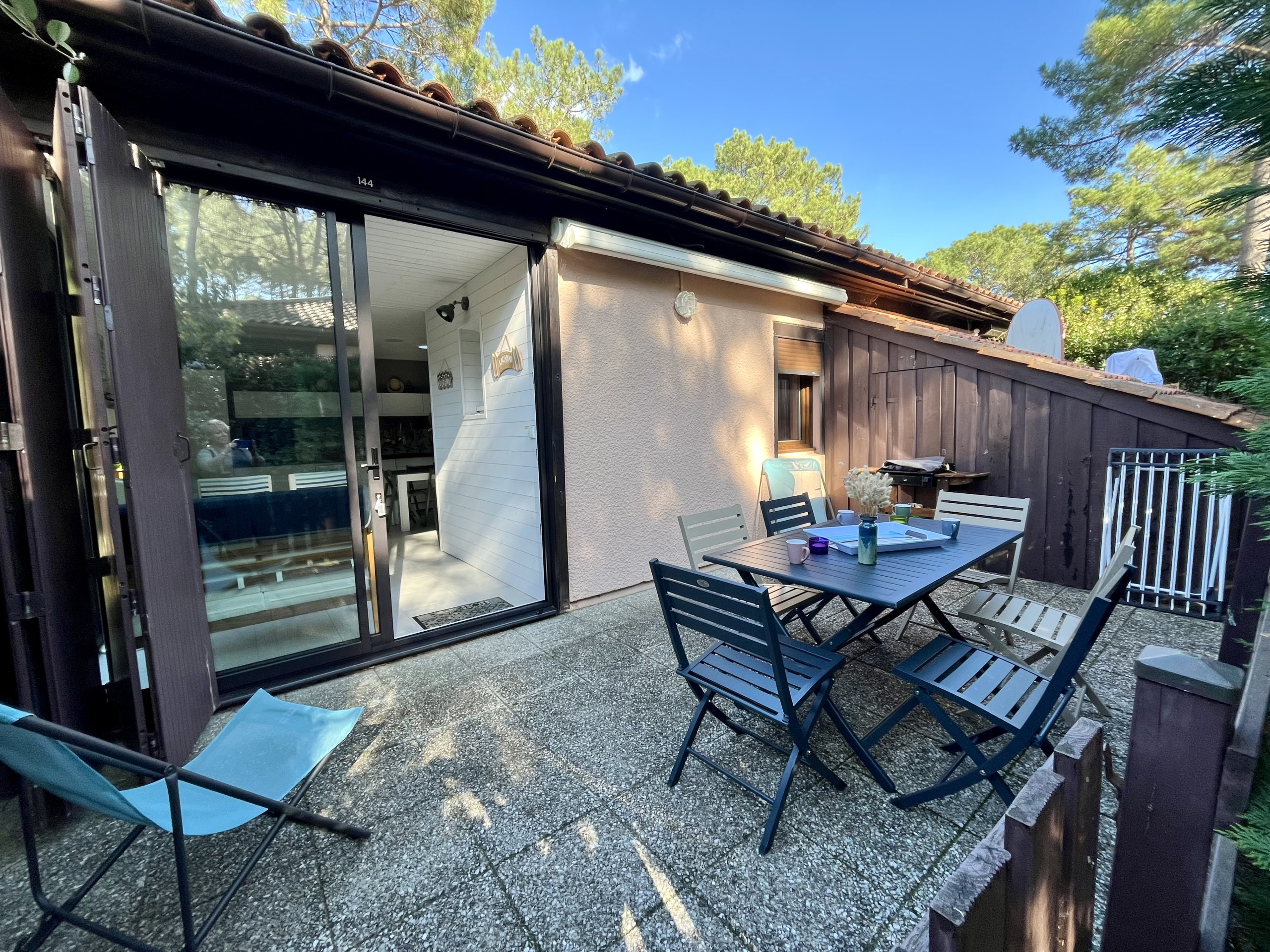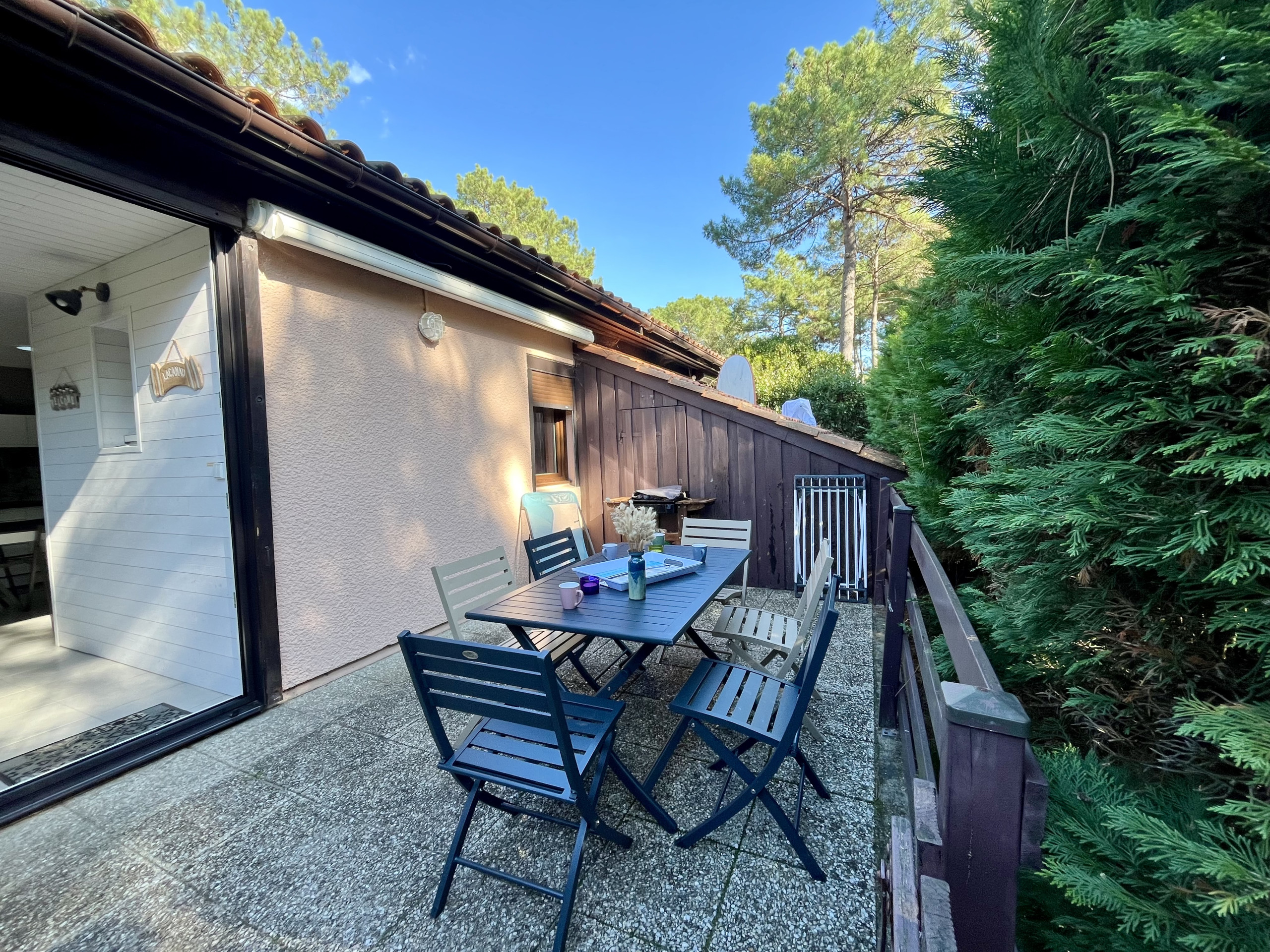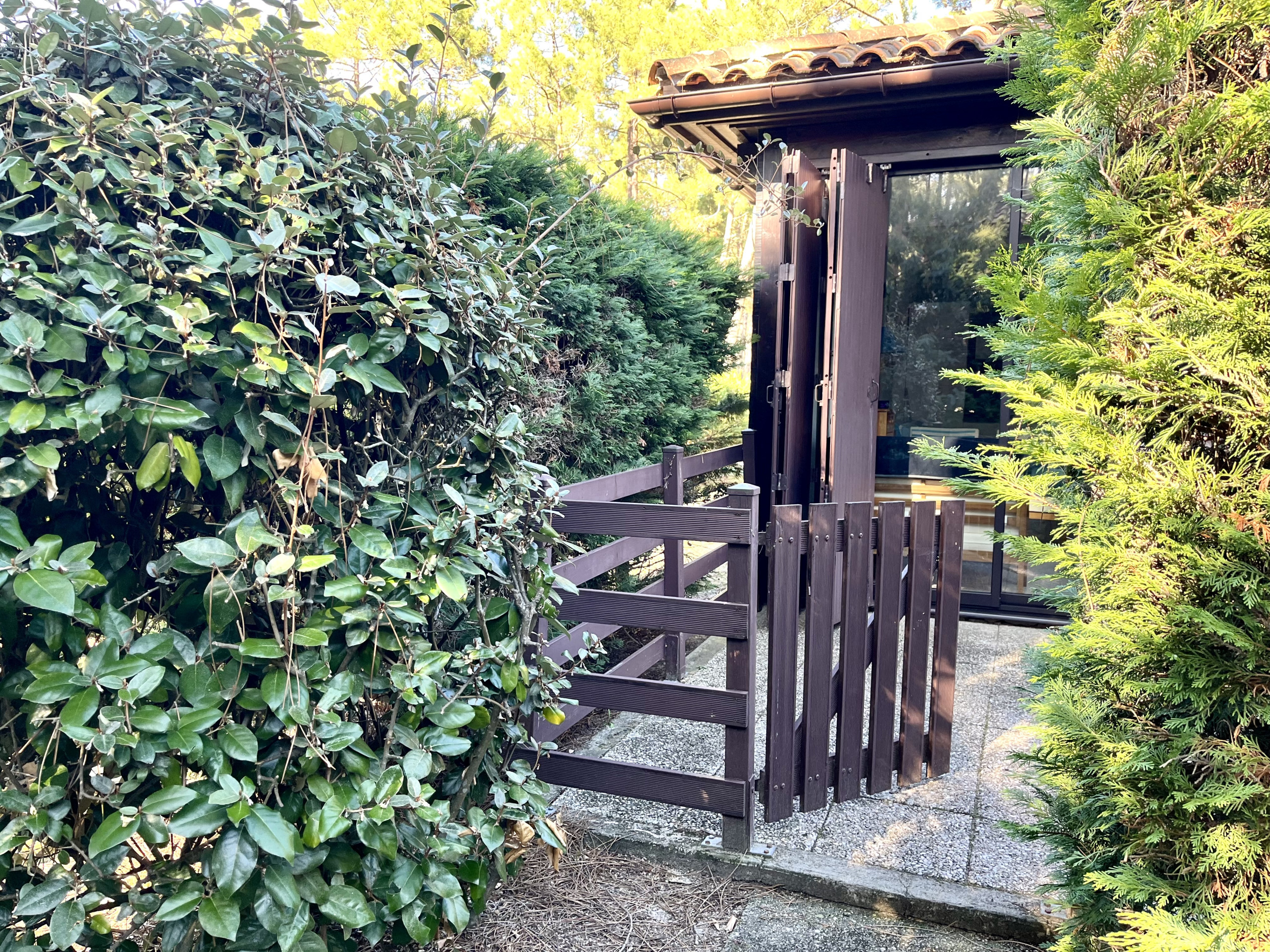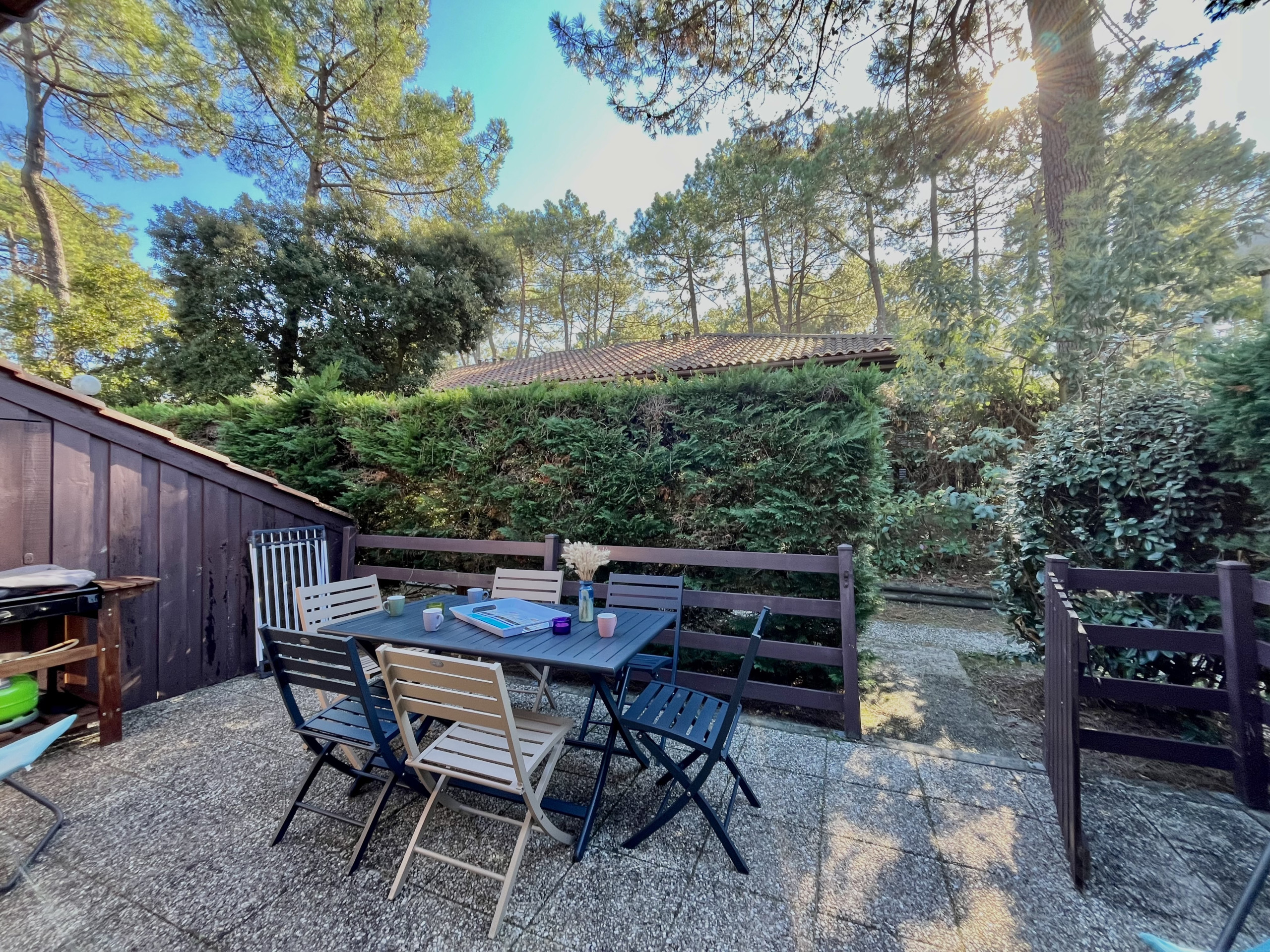 Hameau constitué de maisonnettes mitoyennes en bande, chacune précédée d'une terrasse et mobilier de jardin.