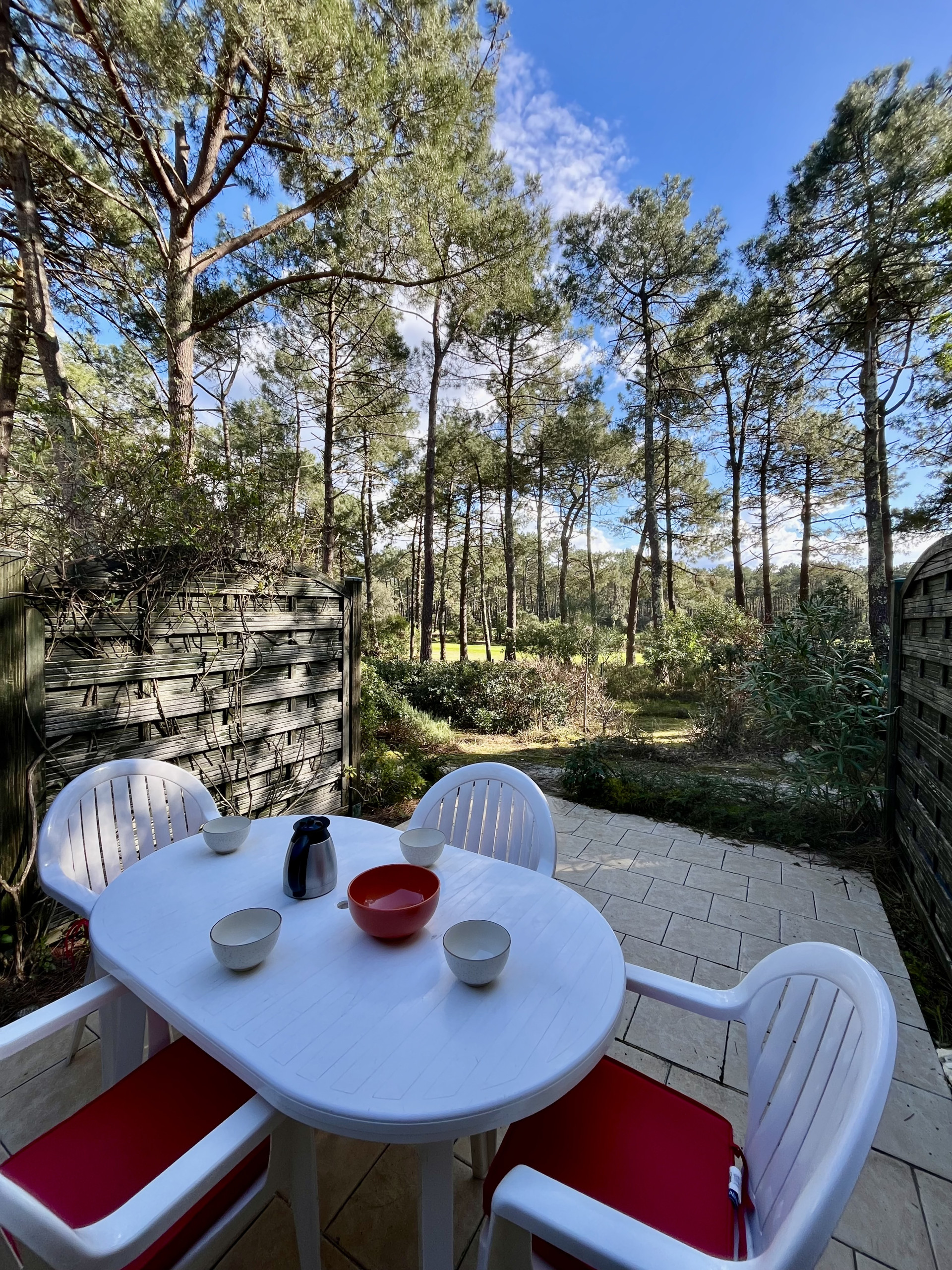 La terrasse située devant le séjour permet de profiter des repas en extérieur et des soirées au calme. Côté localisation, l’océan est à 2,5 km, le lac à 3 km et les commerces à 2,5 km, offrant un accès facile aux plages, aux activités nautiques et aux services de la station.