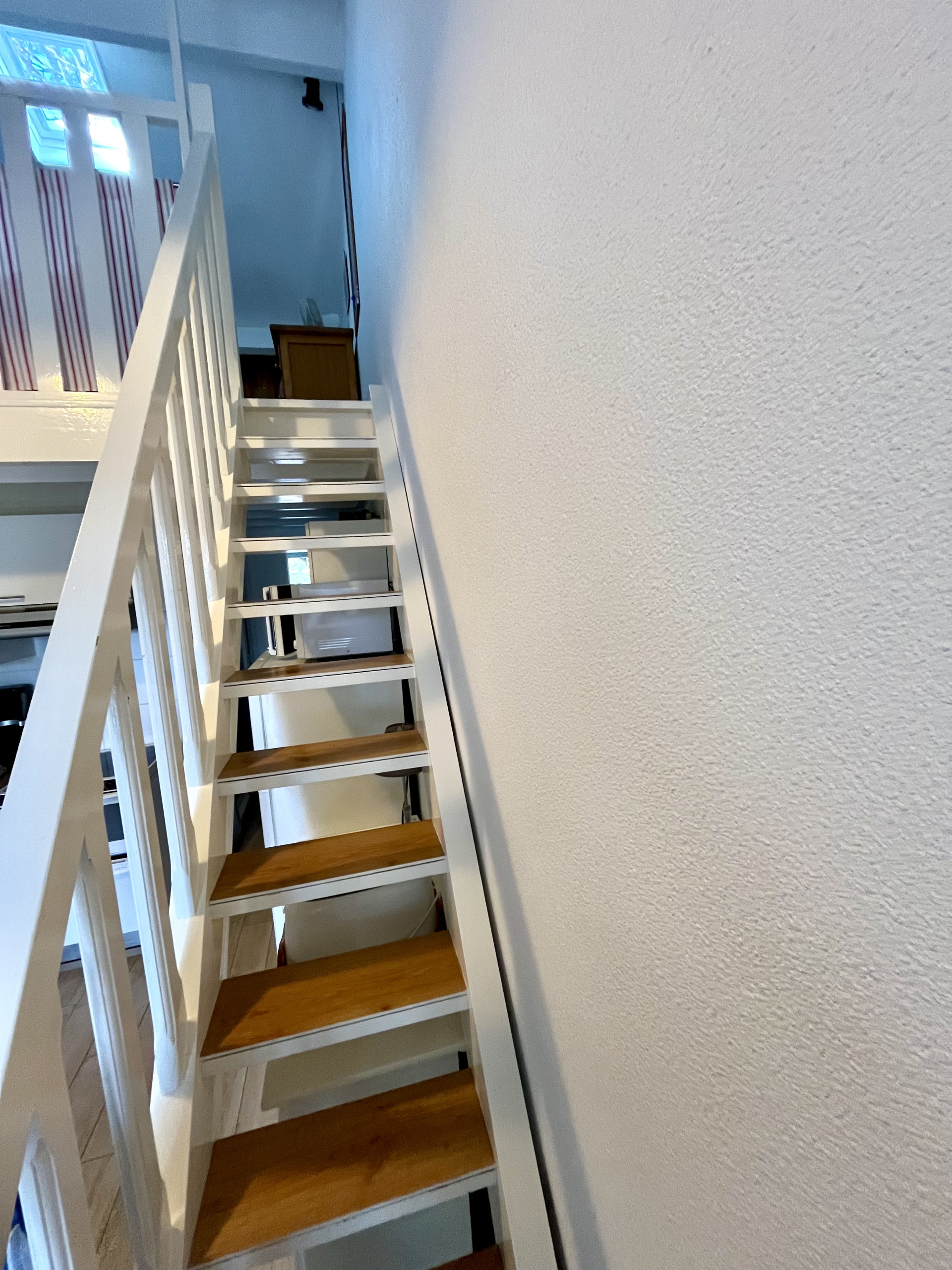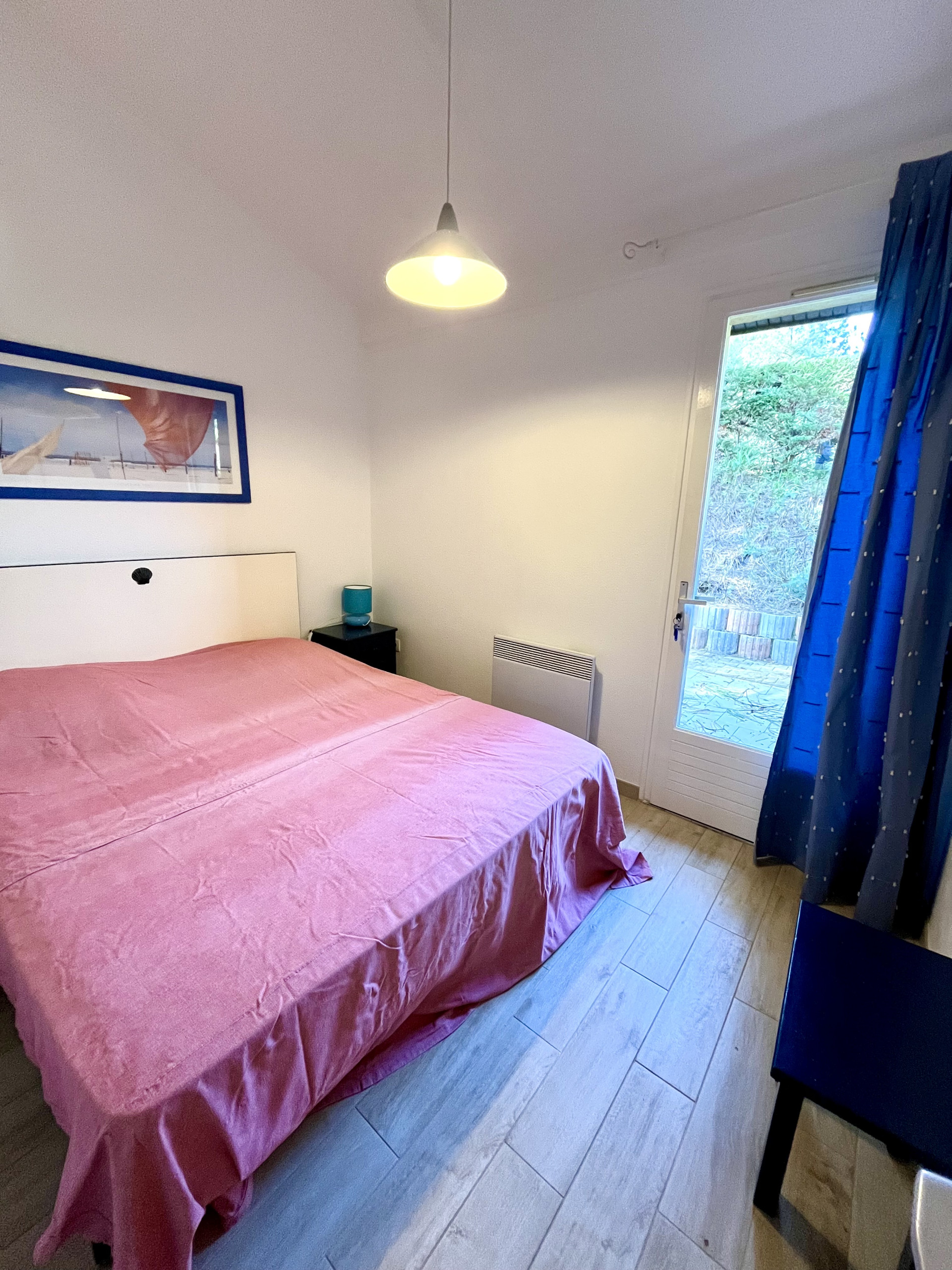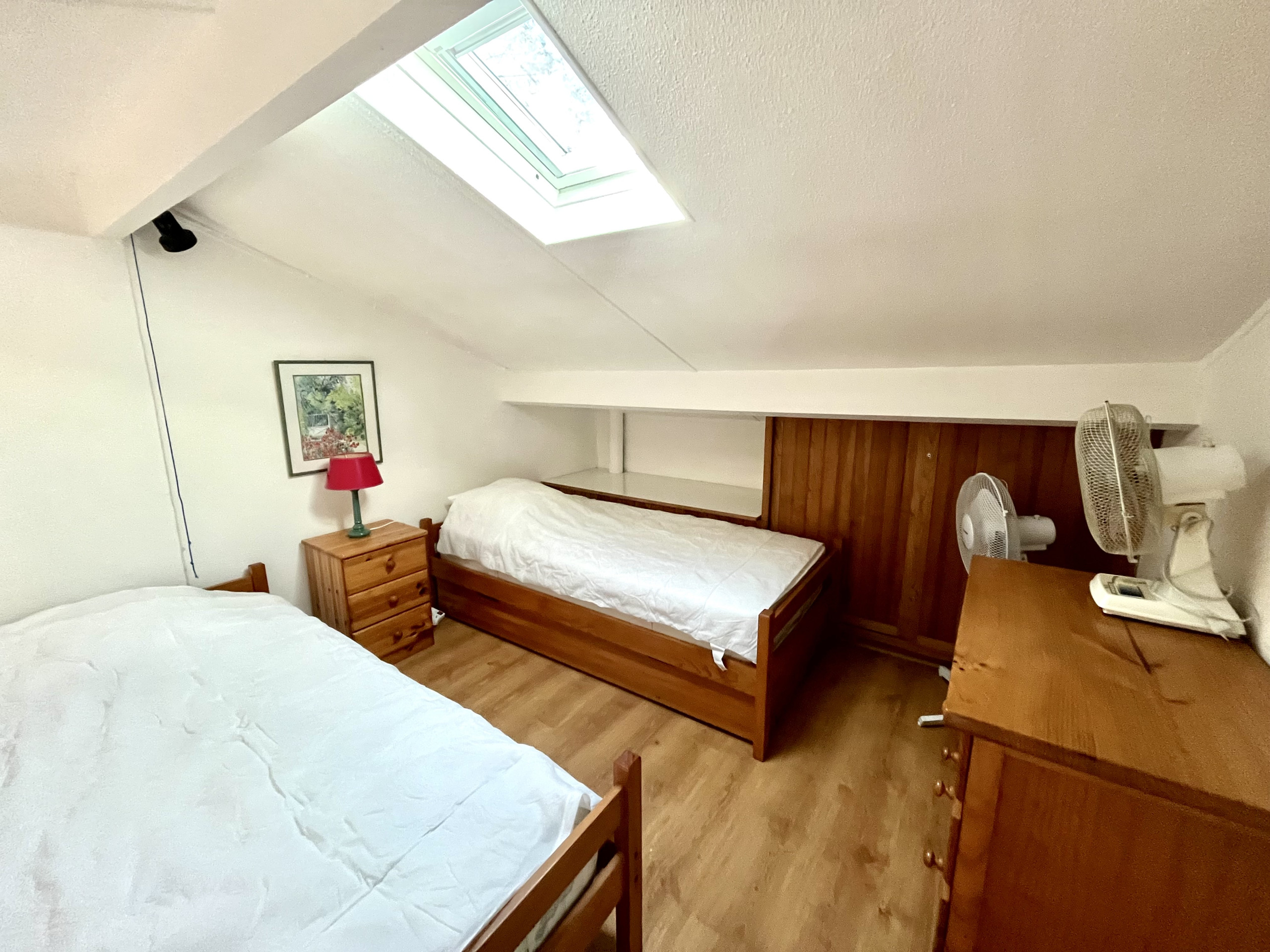 La maison dispose d’une chambre avec un lit double (160x200 cm) et d’un dégagement avec un grand placard, offrant un espace de rangement pratique. À l’étage, une mezzanine accueille deux lits simples (90 cm) et une commode, idéale pour les enfants ou les adolescents. La salle d’eau est fonctionnelle avec une douche, un lavabo, des toilettes et un lave-linge.