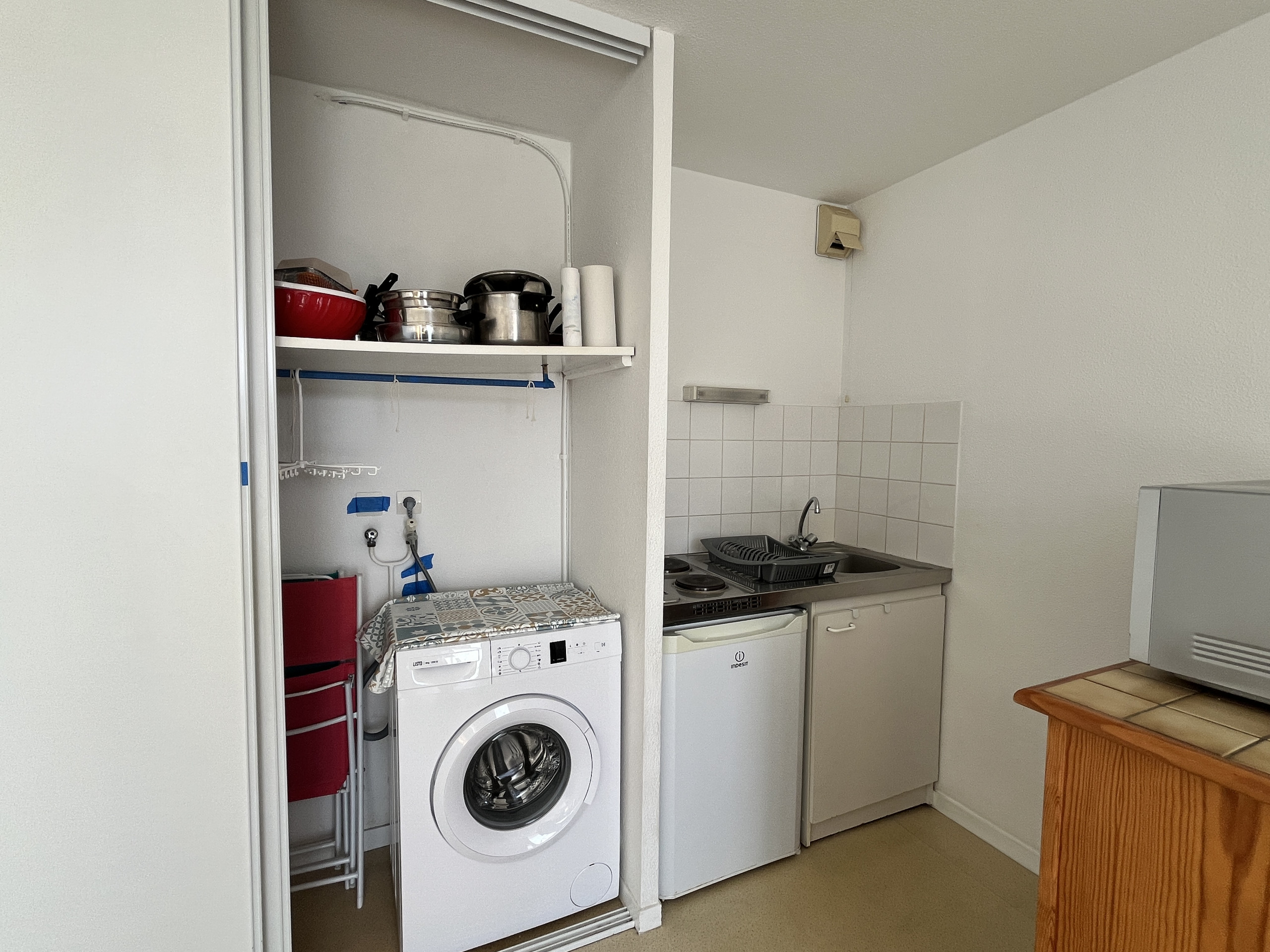 COIN KITCHENETTE : évier - 2 plaques chauffantes électriques - réfrigérateur - lave linge - placards de rangement - vaisselles et ustensiles de cuisine.