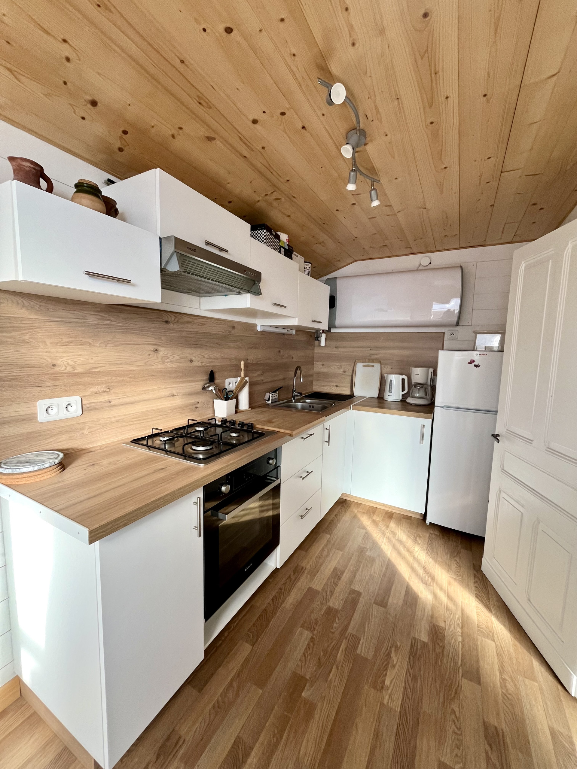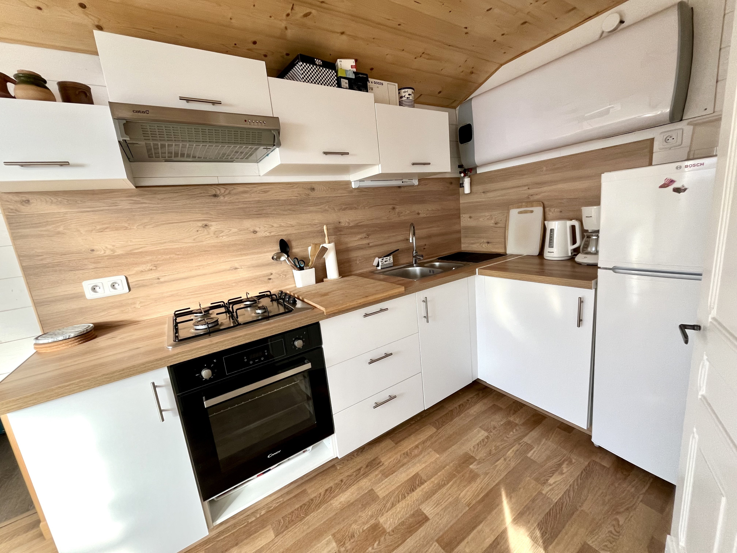 CUISINE : évier - plaques cuisson (gaz) - réfrigérateur congélateur - placards de rangement - vaisselle et ustensiles de cuisine - four - micro-ondes