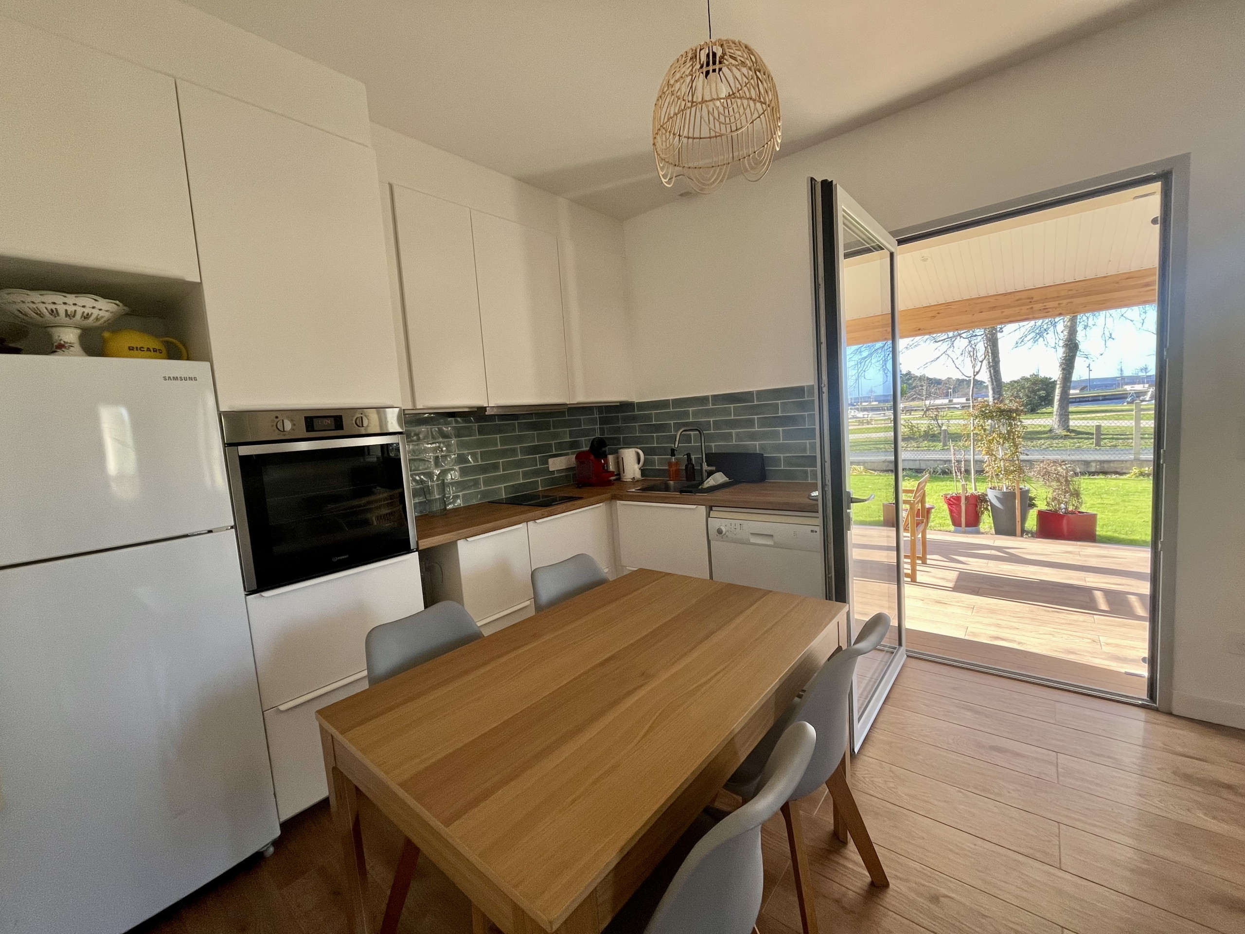 La cuisine ouverte, fonctionnelle et bien équipée, comprend, un évier, des plaques de cuisson induction (2 feux), un four, un réfrigérateur avec partie congélateur, un micro-ondes, un lave-vaisselle, des placards de rangement ainsi que la vaisselle et les ustensiles de cuisine nécessaires pour un séjour en toute autonomie.