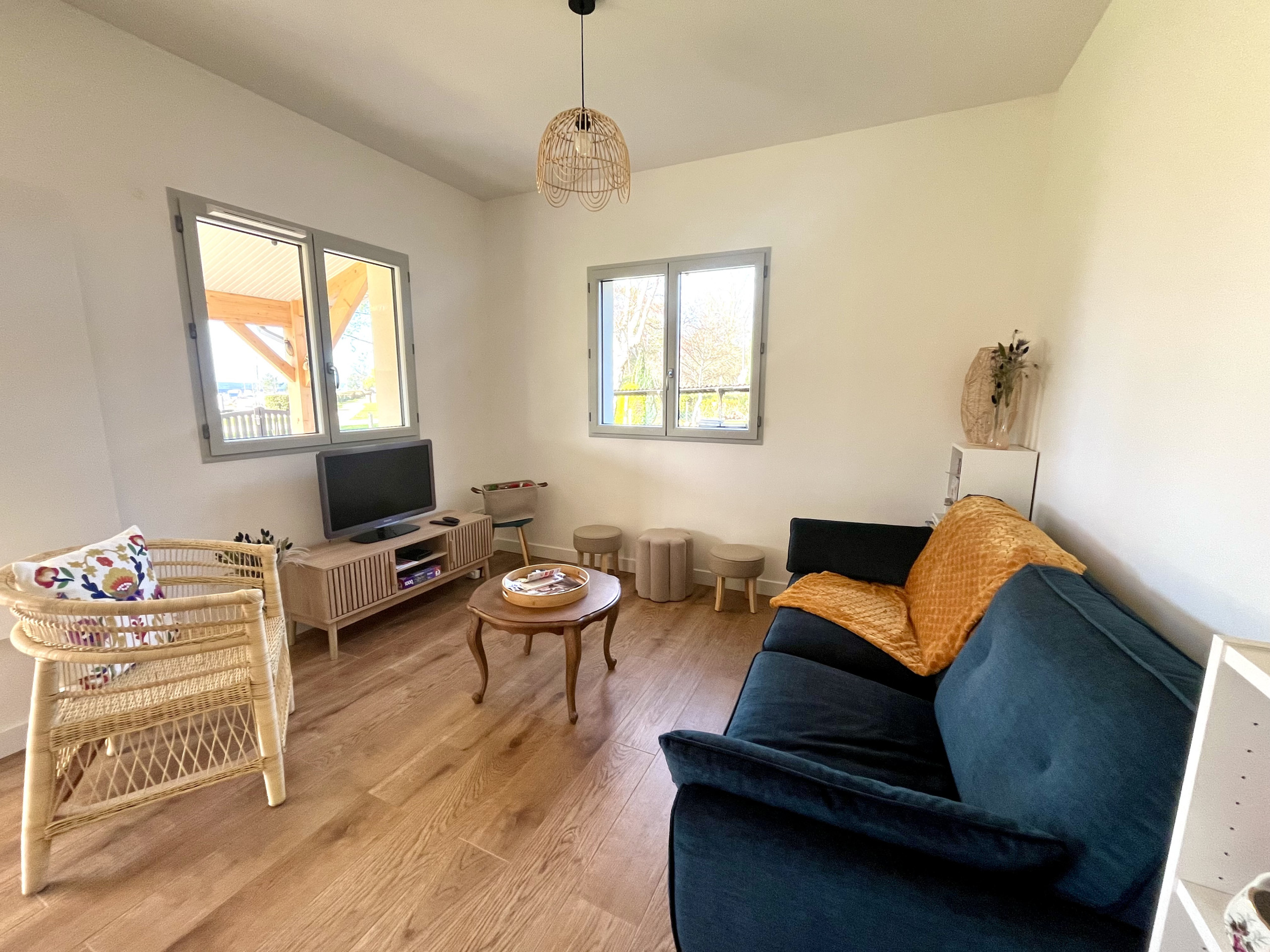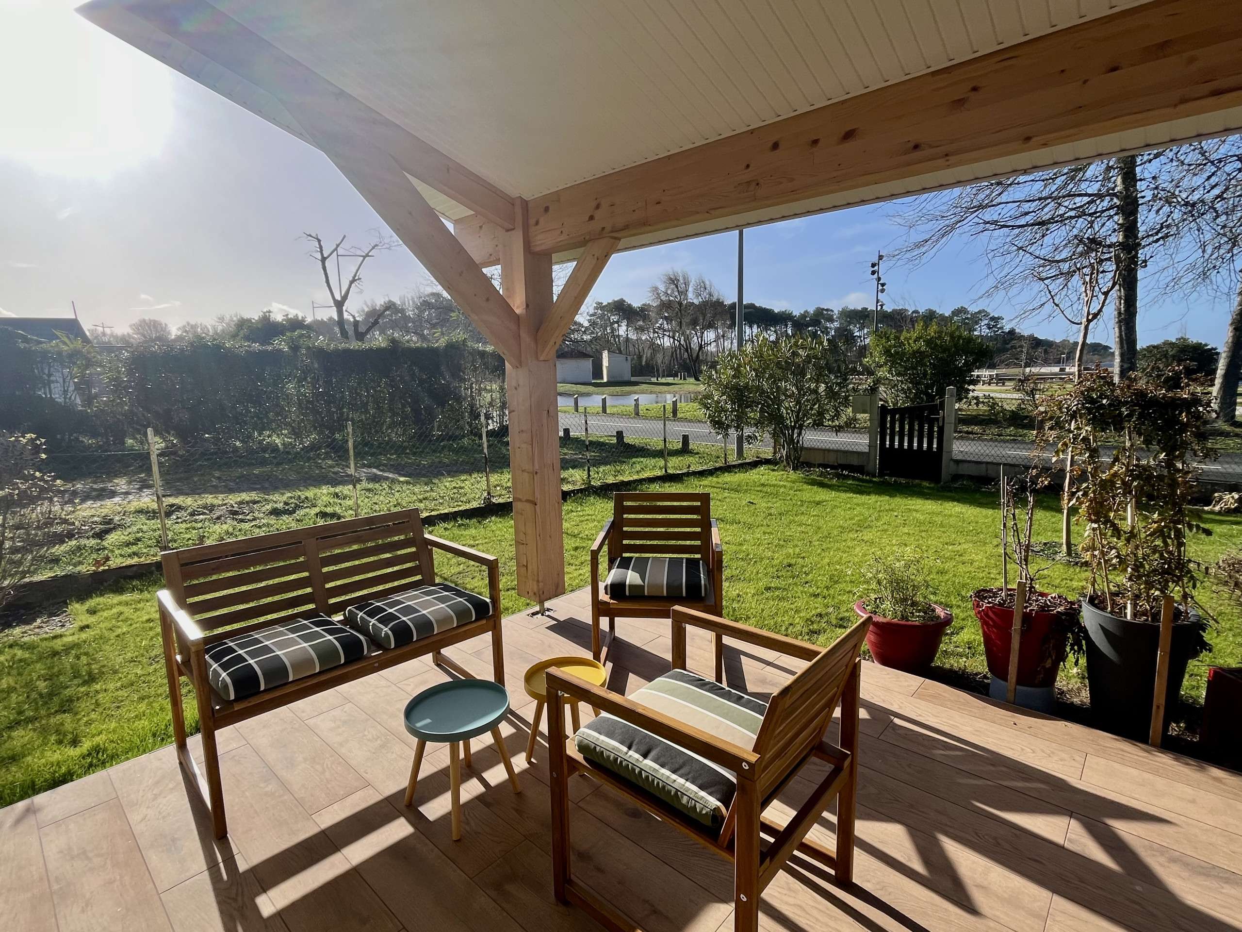 L’intérieur de la maison s’organise autour d’un séjour lumineux, ouvert sur une terrasse couverte. Le coin salon est aménagé avec canapé, fauteuils et télévision, tandis que le coin repas dispose d'une table et des chaises.