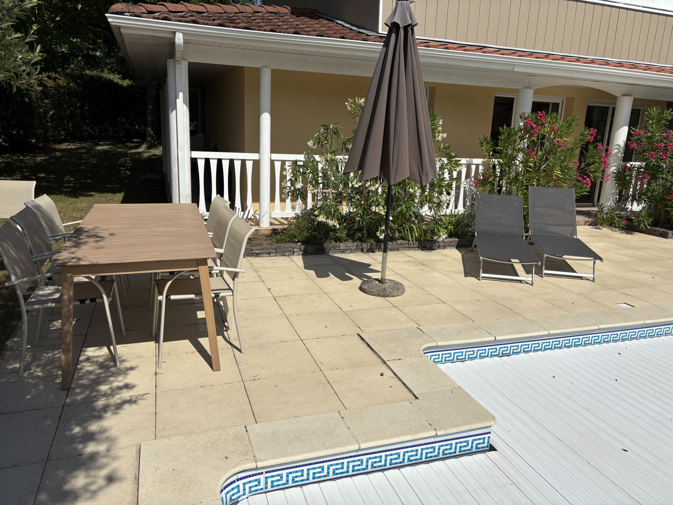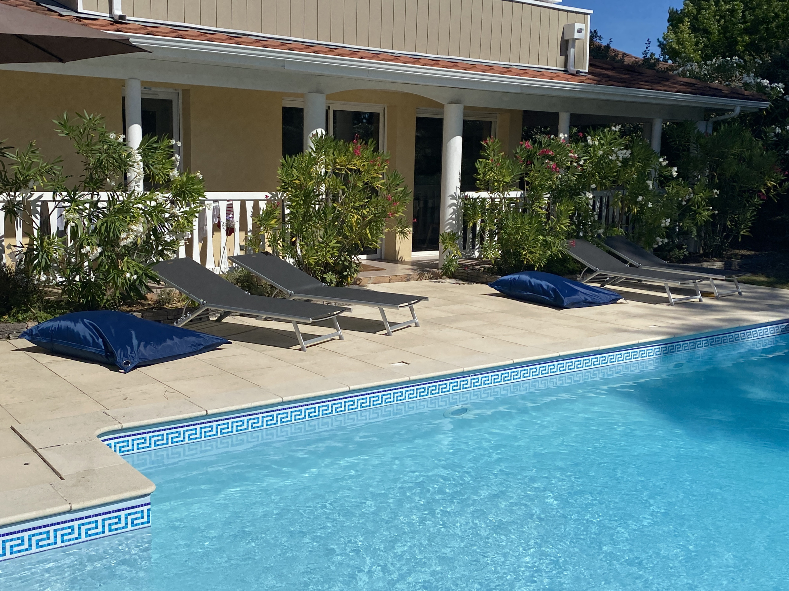 La piscine 8x4 mètres est sécurisée par un volet électrique et une alarme volumétrique. 6 transats, tables avec chaises de jardin et 2 parasols sont à disposition.