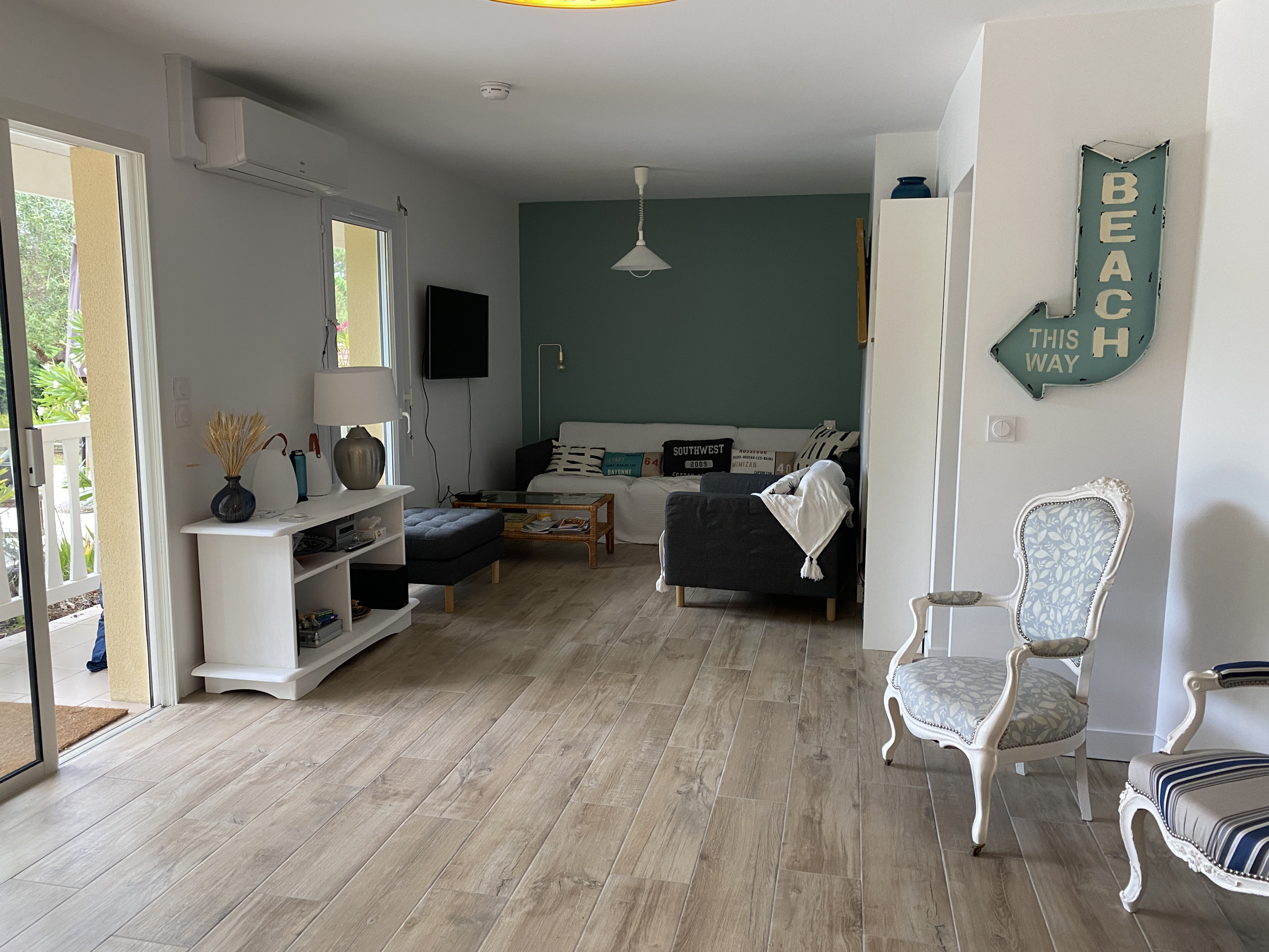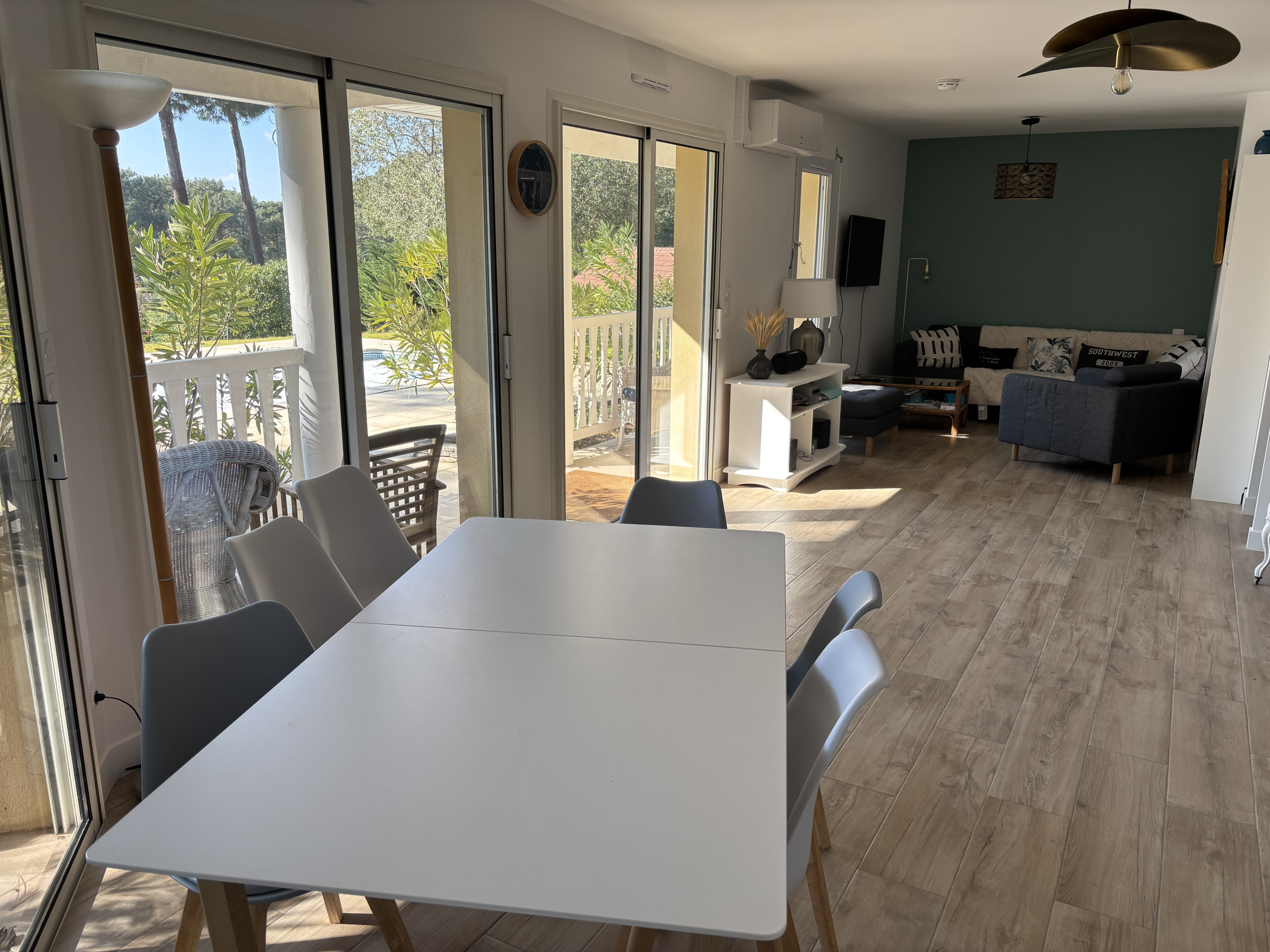 La pièce à vivre lumineuse (exposée sud-ouest) possède de larges baies vitrées donnant sur la terrasse et la piscine. La climatisation (tri-split) a été installée en 2023 et couvre 80m2. Une cuisine américaine récente et très bien équipée (machine à café en grains, machine Nespresso, bouilloire, vaisselle et verres neufs, grand réfrigérateur-congélateur, lave-vaisselle, plaques à induction, four traditionnel et micro-ondes,…), une grande table pouvant accueillir 8 convives, un espace salon avec « smart TV », box internet, 180 chaines, wifi haut débit (fibre), chaine Hifi connecté en Bluetooth, jeux de société…
