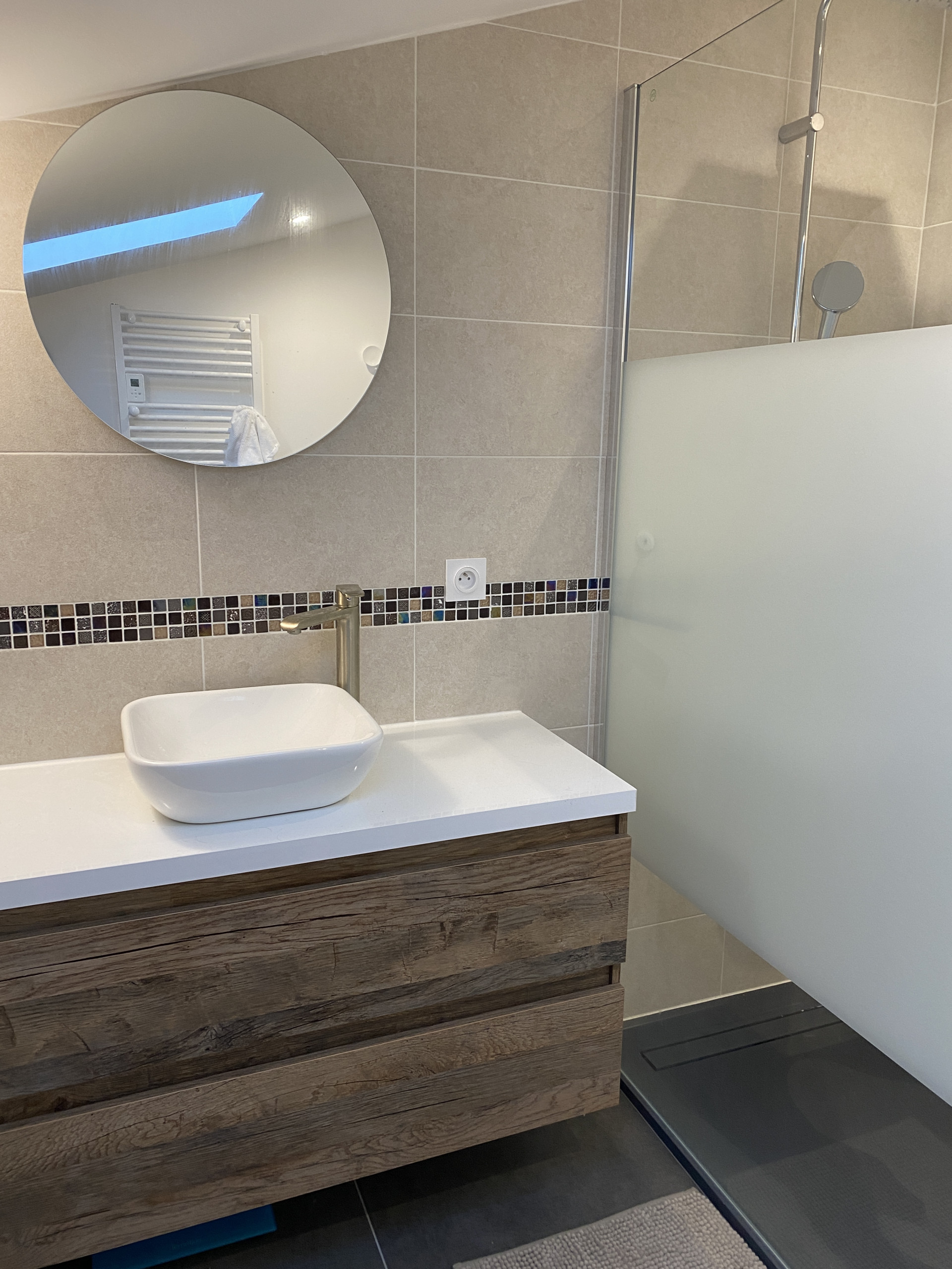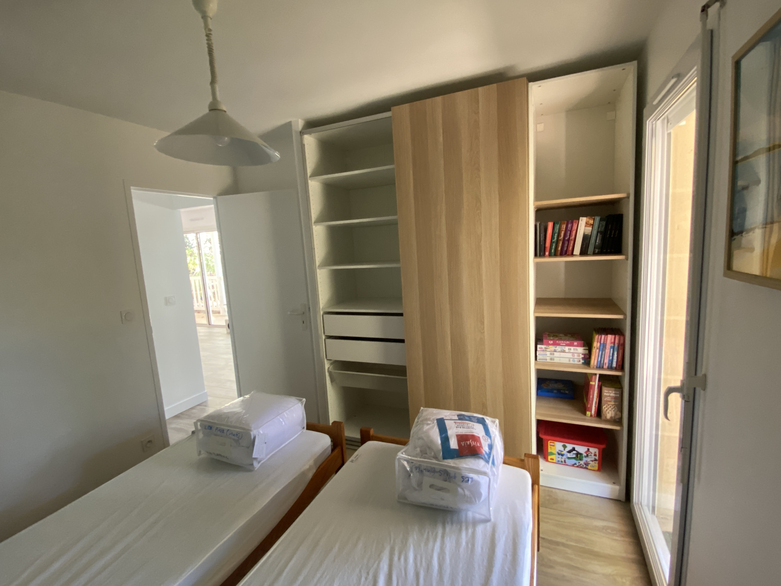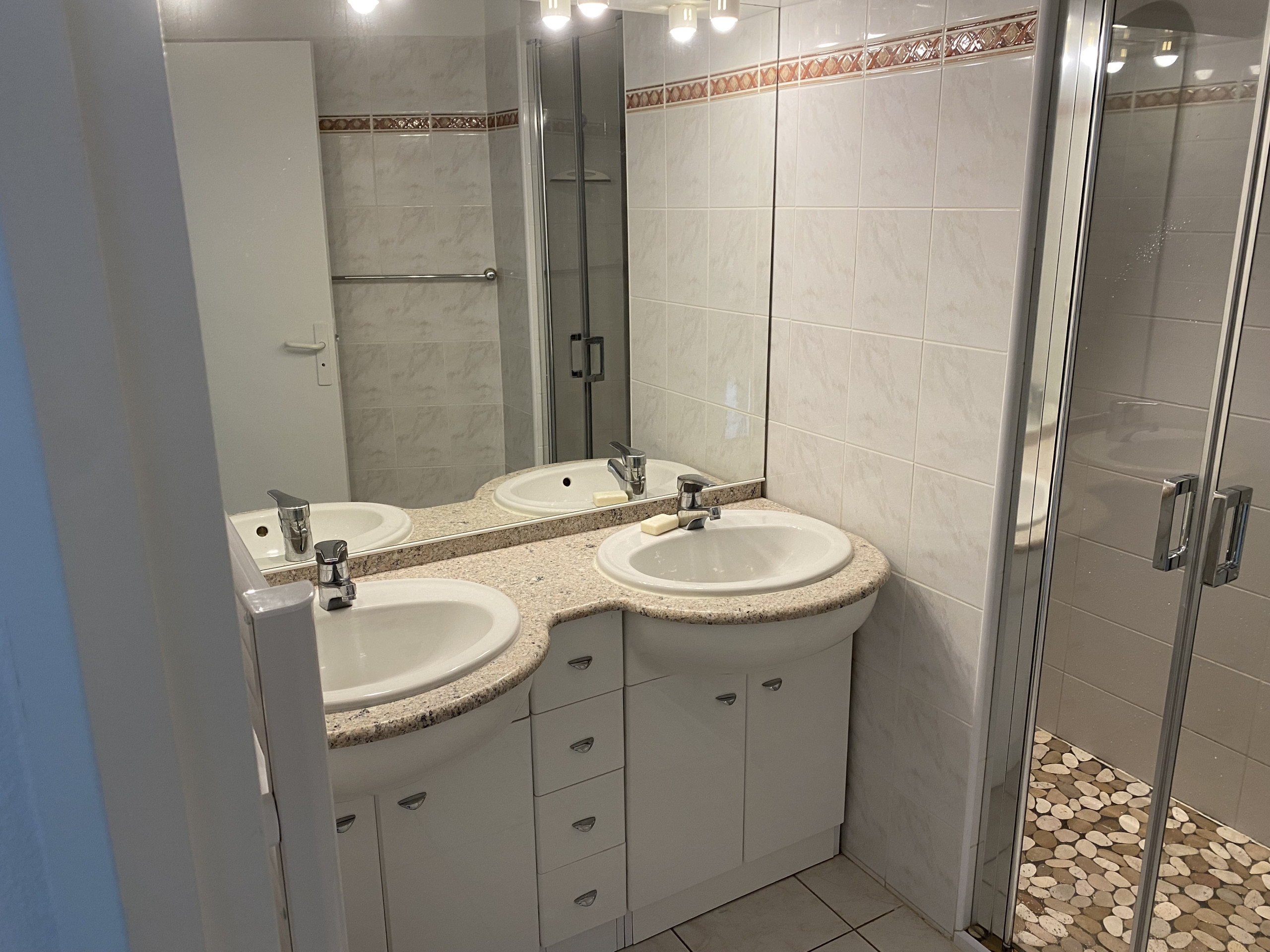 La chambre parentale est isolée de la pièce de vie par quelques marches, elle est équipée d’un lit en 160 (couette) et dispose d’un espace penderie et étagères ainsi que de sa salle de bains et wc séparé. Attenantes à la pièce principale, 1 chambre équipée de 2 lits en 90 (couettes) et d’un espace de rangement avec étagères et penderie. Cette chambre jouxte une salle d’eau avec double vasque et douche à l’italienne ainsi qu’un wc séparé. La buanderie est équipée d’une machine à laver, sèche-linge, fer et table à repasser, aspirateur, balais,…