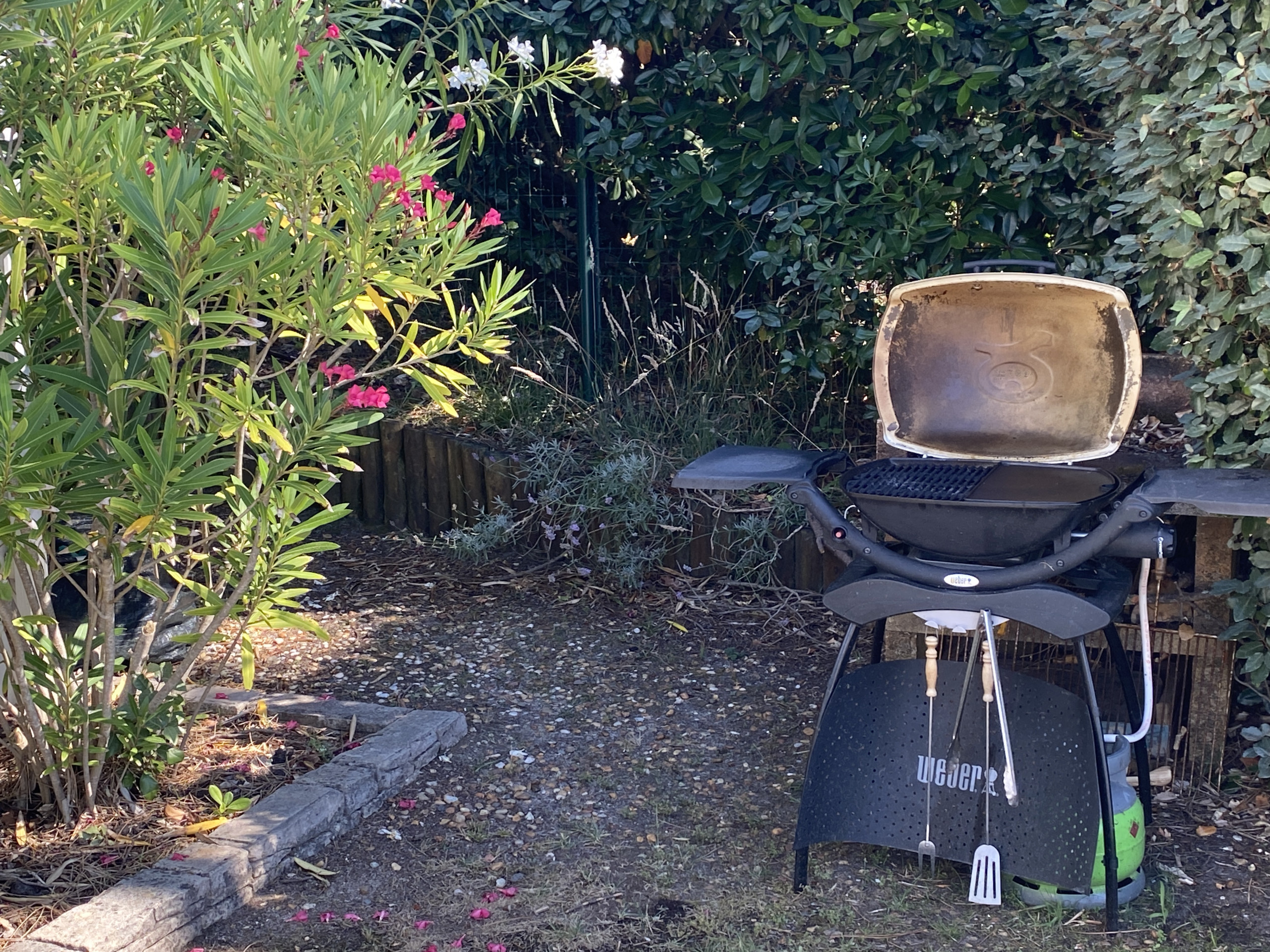 Le jardin très partiellement en pente est spacieux (960 m2), clos et arboré, il dispose d’une table et de 8 chaises, d’un grand barbecue Weber à gaz avec plancha, d’un salon de jardin en bois, de 2 poufs géants, d’une balançoire et d’un hamac (à la demande).